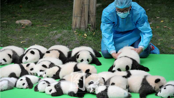 為給黃金周期間的游客帶來意外的驚喜,9月29日,在成都大熊貓繁育研究基地產(chǎn)房內(nèi),23只新生熊貓幼仔依偎在一起,集體亮相與游客見面。