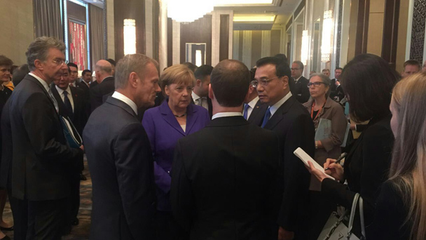 7月15日上午,李克強(qiáng)總理在蒙古國首都烏蘭巴托出席第十一屆亞歐首腦會(huì)議迎接儀式后,與德國總理默克爾、俄羅斯總理梅德韋杰夫、歐洲理事會(huì)主席圖斯克在過道處熟絡(luò)地交談起來。