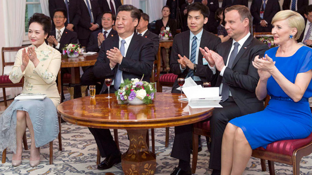 6月19日,國家主席習近平和夫人彭麗媛下午抵達波蘭首都華沙,當晚即應邀來到貝爾維德宮做客。這是習近平和彭麗媛同杜達夫婦共同欣賞波蘭馬佐夫舍民族歌舞團的精彩演出。新華社記者 謝環馳 攝