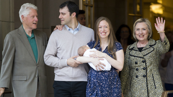 紐約當地時間2016年6月20日,美國前總統克林頓的女兒切爾西抱著寶寶出院,丈夫馬克·梅茲文斯基、母親希拉里及父親克林頓陪同。