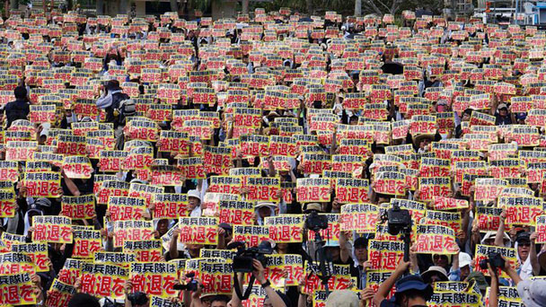6月19日,在日本沖繩縣首府那霸市一座公園內(nèi),市民手舉“撤走(美國)海軍陸戰(zhàn)隊”的標(biāo)語。新華社記者沈紅輝攝 6月19日,在日本沖繩縣首府那霸市一座公園內(nèi),一名抗議者手舉“我是美軍暴行受害者”的標(biāo)語。