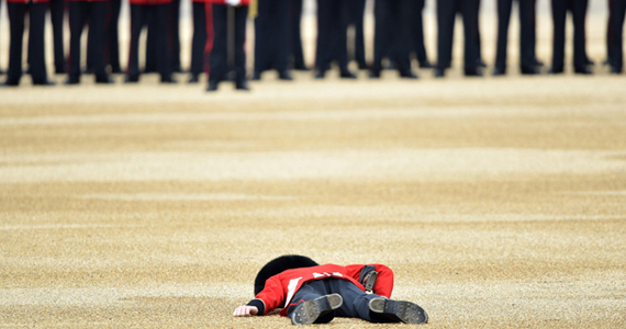 當地時間2016年6月11日,英國女王伊麗莎白二世的90歲官方生日慶典舉行。女王及王室成員乘坐馬車離開白金漢宮參加皇家軍隊閱兵儀式。然而,現場一名衛兵因體力不支暈倒在地,被抬到場外。