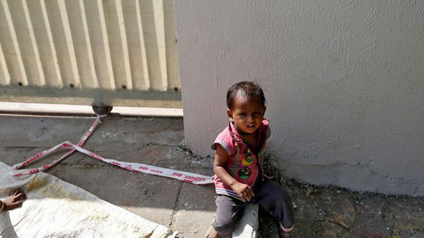 在印度西部的一處建筑工地外,頂著40攝氏度的高溫,右腳被膠帶綁住,膠帶的另一端固定著一塊大石頭,年僅15個月的印度女童希瓦尼就這樣赤著腳,無人看管,一待一天,長達9小時。