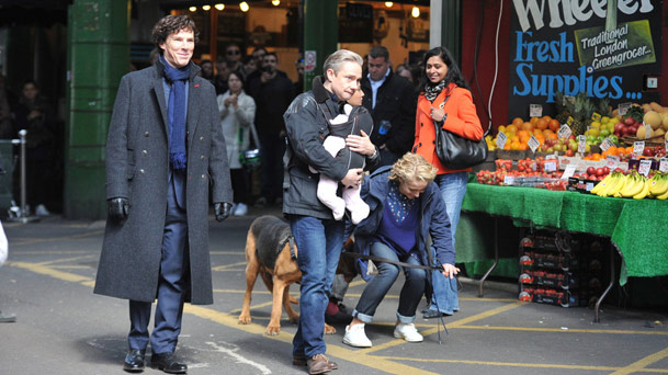 當(dāng)?shù)貢r(shí)間2016年4月26日,英國倫敦,《神探夏洛克4》熱拍中,華生馬丁-弗里曼(Martin Freeman)變身奶爸胸前抱著孩子,而他現(xiàn)實(shí)生活中的女友也同框亮相搭戲.