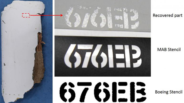 調查報告說,從字號和顏色來看,“676EB”字樣是馬來西亞方面后來噴涂上的,和原廠配置有所不同;而“禁止踩踏”字樣也符合馬航的噴涂風格。