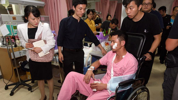 7月7日凌晨,在泰國普吉島,翻船事故幸存者林宏政(左)在病房照顧受傷的同學。當?shù)貢r間5日17時45分左右,兩艘游船在泰國普吉島附近海域突遇特大暴風雨,發(fā)生傾覆并沉沒。當?shù)貢r間5日17時45分左右,兩艘游船在泰國普吉島附近海域突遇特大暴風雨,發(fā)生傾覆并沉沒。
