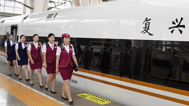 7月1日,旅客乘坐首趟北京南至上海虹橋G7次長編組“復(fù)興號”動車組列車。