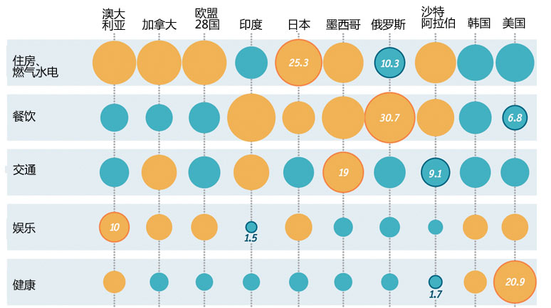 對(duì)俄羅斯人來(lái)說(shuō),大量收入都用在了食品和煙酒上。在美國(guó),醫(yī)療是最大的支出。在日本,住房開(kāi)銷超過(guò)了平均收入的四分之一。