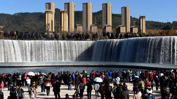 1月2日,游人在新建成的昆明瀑布公園參觀游覽。公園的瀑布景觀區充分利用牛欄江引水入滇工程而形成人工瀑布及湖泊,其利用約12.5米的地勢高差,建設成寬幅約400米的人工瀑布。新華社記者藺以光 攝  近日,位于云南省昆明市北部山水新區的昆明瀑布公園建設完工并免費向市民開放。