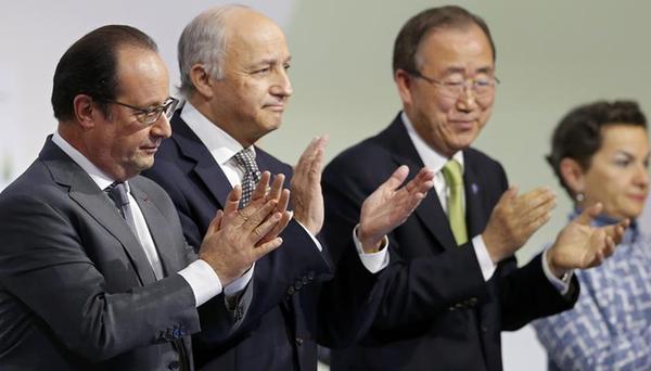 12月12日,在巴黎北部市郊的布爾歇展覽中心,法國總統奧朗德(左一)、法國外交部長、巴黎氣候變化大會主席法比尤斯(左二)以及聯合國秘書長潘基文(左三)在巴黎氣候變化大會上鼓掌。