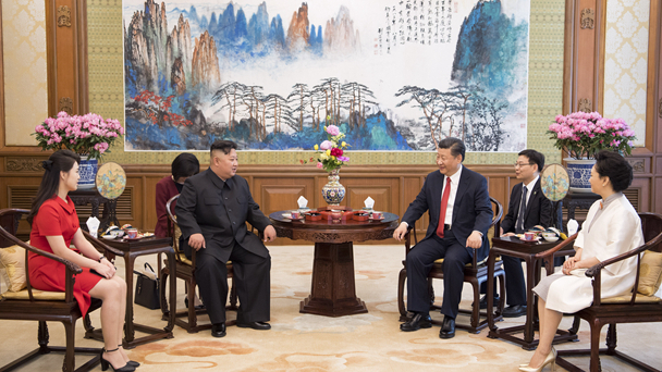 中共中央總書記、國家主席習近平20日在釣魚臺國賓館會見朝鮮勞動黨委員長、國務委員會委員長金正恩。習近平總書記夫人彭麗媛、金正恩委員長夫人李雪主參加會見。