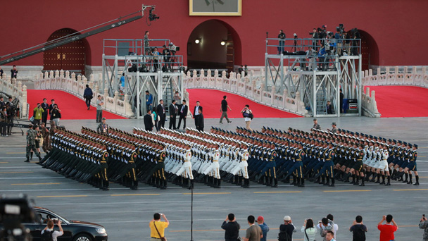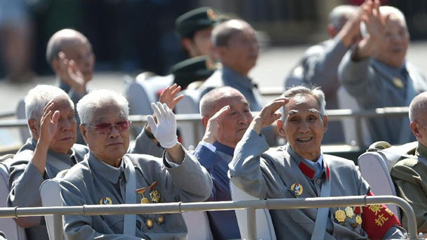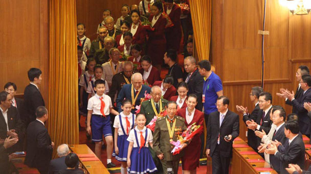 在紀念中國人民抗日戰爭暨世界反法西斯戰爭勝利70周年文藝晚會開演之前,70名抗戰老戰士緩緩步入人民大會堂。