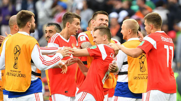 當日,在莫斯科進行的2018俄羅斯世界杯揭幕戰中,俄羅斯隊以5比0戰勝沙特阿拉伯隊。新華社記者 徐子鑒 攝 6月14日,俄羅斯隊球員切里舍夫(右)與沙特阿拉伯隊球員布萊克在比賽中拼搶。