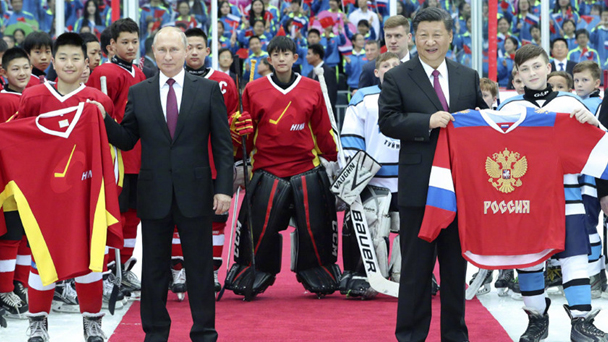 國家主席習近平8日晚同俄羅斯總統普京在天津體育館共同觀看中俄青少年冰球友誼賽。兩國元首同小隊員們親切交談、合影,并共同為比賽開球。