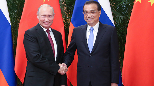 6月8日,國務院總理李克強在北京人民大會堂會見來華進行國事訪問并出席上海合作組織青島峰會的俄羅斯總統普京。