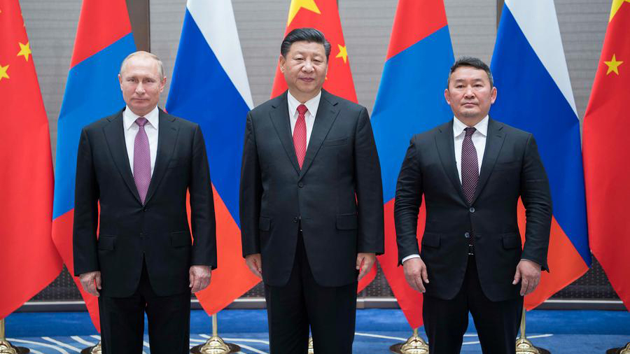 6月9日,國家主席習近平同俄羅斯總統普京、蒙古國總統巴特圖勒嘎在青島舉行中俄蒙三國元首第四次會晤。