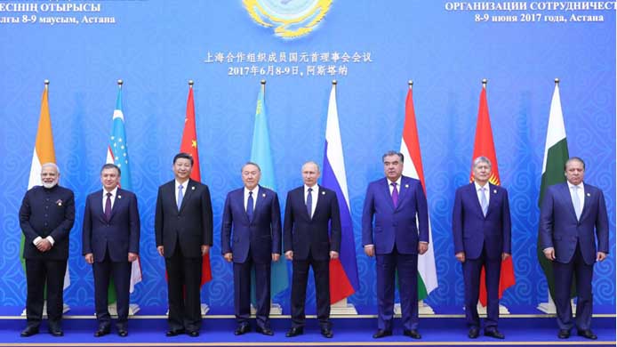 上海合作組織成員國領導人10日共同會見記者。國家主席習近平作為主席國元首發表講話。印度總理莫迪、哈薩克斯坦總統納扎爾巴耶夫、吉爾吉斯斯坦總統熱恩別科夫、巴基斯坦總統侯賽因、俄羅斯總統普京、塔吉克斯坦總統拉赫蒙、烏茲別克斯坦總統米爾濟約耶夫出席。