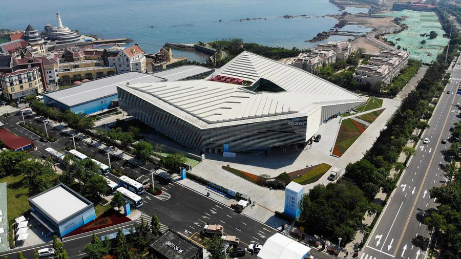 這是位于青島市嶗山區東海路上的上海合作組織青島峰會新聞中心(6月3日無人機拍攝)。據介紹,新聞中心總建筑面積約3.5萬平方米,設立取證中心、咨詢臺、公共工作區、新聞發布廳、會議采訪、通信保障等29個工作小組,職能涵蓋媒體接待、采訪、通信、交通、醫療、安全等全方位保障。