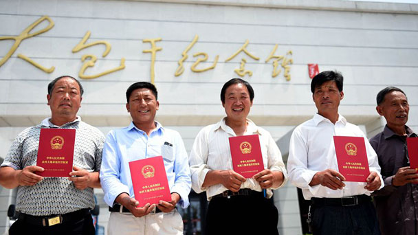 安徽鳳陽(yáng)縣小崗村農(nóng)民展示領(lǐng)到的《農(nóng)村土地承包經(jīng)營(yíng)權(quán)證》(2015年7月8日攝)。