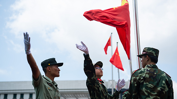當日,“國旗下的說話·2018年澳門中學生國旗手訓練營”舉行。來自30所澳門中學的300余名中學生會聚解放軍駐澳門部隊氹仔軍營,在迷彩的青春方陣中親手升起鮮艷的五星紅旗。新華社記者張金加 攝