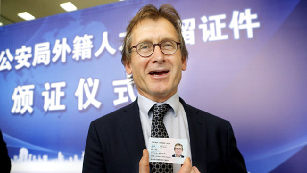 5月2日,諾貝爾獎得主伯納德·費林加在展示領取的永久居留身份證。當日,上海為伯納德·費林加等7名外籍人士頒發外國人永久居留身份證和居留許可,這將給他們出入境、在華生活和工作帶來諸多便利。