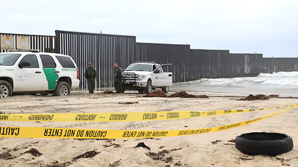 4月30日,在圣迭戈美墨邊境墻美國一側,美國警察在執勤。日前,數百名中美洲人到達墨西哥邊境城市蒂華納,準備向美國政府申請避難。日前,數百名中美洲人到達墨西哥邊境城市蒂華納,準備向美國政府申請避難。