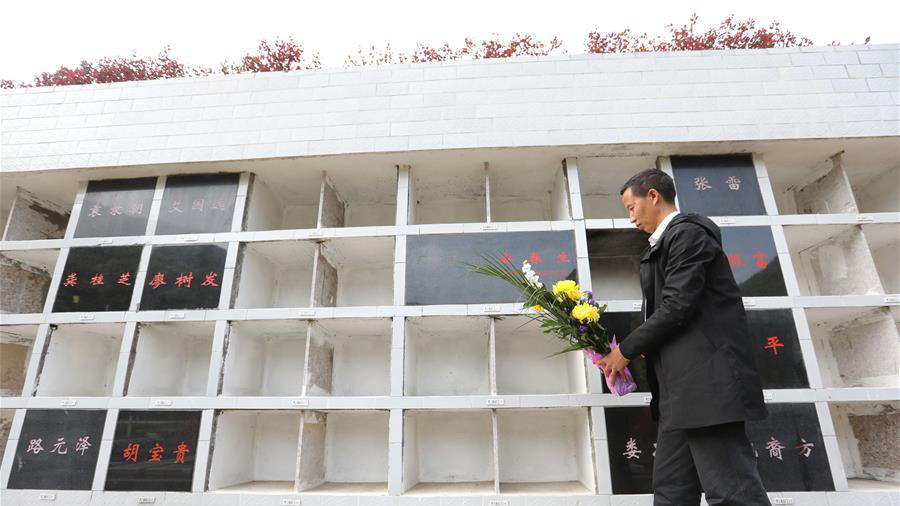 4月2日,市民在六枝仙鶴山生態陵園手捧鮮花,祭祀通過花壇葬安葬的親人。新華社記者 歐東衢攝  4月2日,市民在六枝仙鶴山生態陵園手捧鮮花,祭祀通過花壇葬安葬的親人。