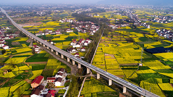3月21日,一列動(dòng)車正通過陜西省漢中市南鄭縣新集鎮(zhèn)油菜花海(無(wú)人機(jī)拍攝)。新華社記者 胡虎虎 攝 3月24日,河北省靈壽縣南營(yíng)鄉(xiāng)車谷砣村黨支部書記陳春芳介紹他帶領(lǐng)村民開辦農(nóng)家樂脫貧的情況。