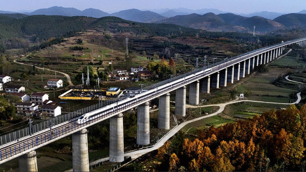 從未坐過任何火車、家住秦嶺腹地的陜西省佛坪縣東岳殿村六組73歲的葉明吉和妻子專門趕到佛坪高鐵站,與模擬運行的CRH3A型動車組列車合影留念(11月25日攝)。從秦漢時的古棧道到2007年9月西安至成都高速公路的全線開通,跨越了2000多年;而從高速公路到高速鐵路的開通,僅僅用了10年。