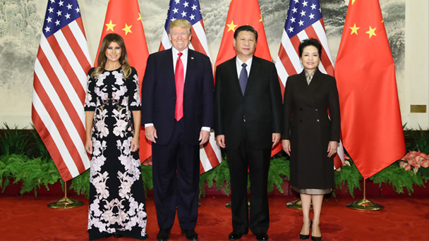 11月8日下午,國家主席習近平和夫人彭麗媛在北京故宮博物院迎接來華進行國事訪問的美國總統(tǒng)特朗普和夫人梅拉尼婭。