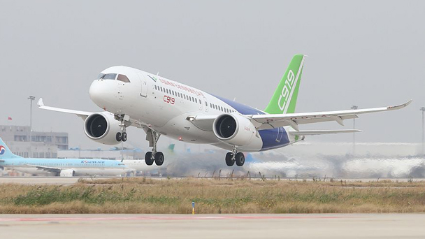 2017年11月10日,上海,國產(chǎn)大飛機C919起飛前往西安閻良。這是C919的首次遠距離飛行。