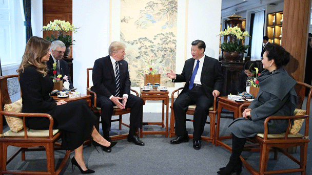 習(xí)近平熱烈歡迎特朗普來華進(jìn)行國事訪問,感謝特朗普全家今年4月在海湖莊園的熱情接待,祝愿特朗普夫婦在中國訪問愉快。特朗普使用平板電腦向習(xí)近平夫婦展示外孫女阿拉貝拉用中文演唱歌曲、背《三字經(jīng)》和古詩的視頻。