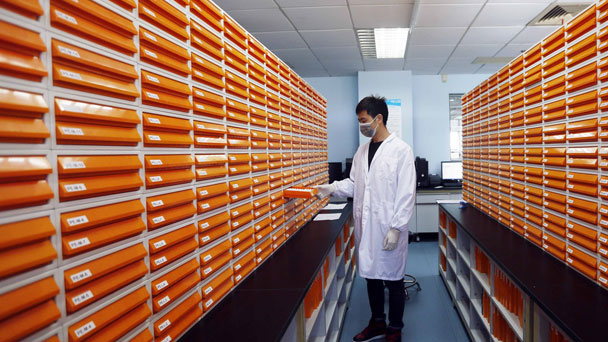 走進(jìn)生物銀行,高高的橙色架子上有一個個類似保險柜的小抽屜,這里儲存了50萬份腫瘤組織,是銀行的第一批“庫存”。