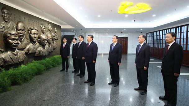 10月31日上午,黨的十九大閉幕僅一周,習(xí)近平和李克強(qiáng)、栗戰(zhàn)書、汪洋、王滬寧、趙樂際、韓正,從北京乘專機(jī)來到上海,到興業(yè)路76號集體瞻仰中共一大會址。