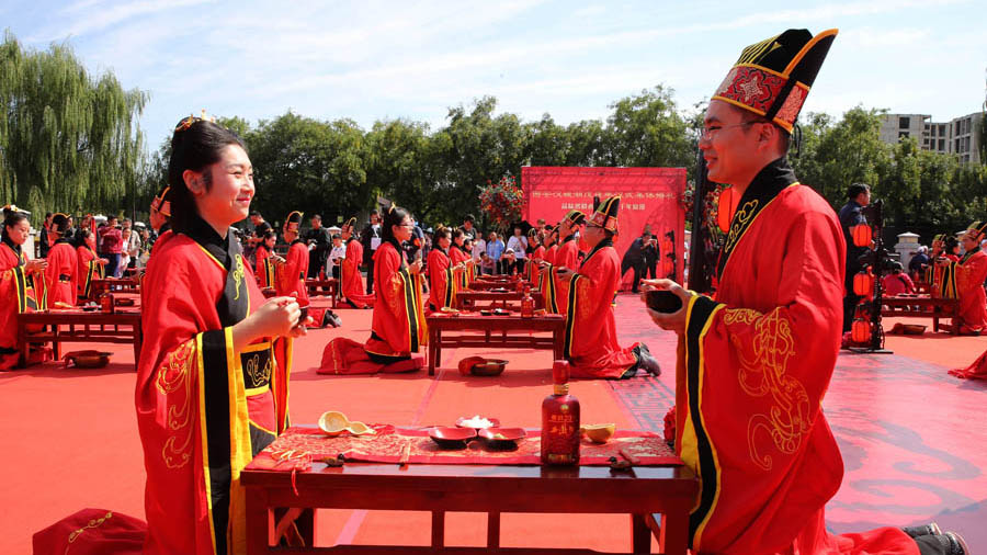國慶節(jié)上午,在西安漢城湖封禪廣場舉辦了一場“戊戌年漢式集體婚禮”。