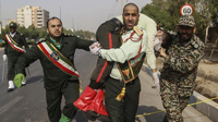 9月22日,在伊朗胡齊斯坦省首府阿瓦士,人們轉移一名受傷士兵。新華社發 新華社德黑蘭9月22日電 一伙武裝人員22日在伊朗南部胡齊斯坦省首府阿瓦士舉行的紀念兩伊戰爭爆發38周年閱兵儀式上實施襲擊,迄今已造成至少24人喪生、53人受傷。9月22日,在伊朗胡齊斯坦省首府阿瓦士,士兵們躲避襲擊。