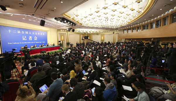 3月6日,十二屆全國人大五次會議舉行記者會,邀請國家發展和改革委員會主任何立峰、副主任張勇、副主任寧吉喆就“經濟社會發展與宏觀調控”的相關問題回答中外記者的提問。圖為記者會現場。