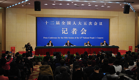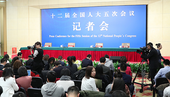 十二屆全國人大五次會議新聞中心于3月8日(星期三)10時在梅地亞中心多功能廳舉行記者會,邀請外交部部長王毅就“中國的外交政策和對外關系”的相關問題回答中外記者的提問。圖為記者會正在進行。