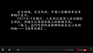 八集大型紀(jì)錄片《強(qiáng)軍》在中央電視臺(tái)開(kāi)播。第一集《逐夢(mèng)》,展現(xiàn)了習(xí)近平提出強(qiáng)軍夢(mèng),實(shí)現(xiàn)強(qiáng)軍目標(biāo)、建設(shè)世界一流軍隊(duì)的強(qiáng)軍興軍大思路大格局,集中展示過(guò)去5年中國(guó)軍隊(duì)的強(qiáng)軍成就。