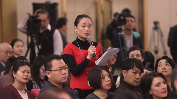 十三屆全國人大一次會議新聞中心于3月7日上午在梅地亞中心多功能廳舉行記者會,邀請財政部部長肖捷,副部長史耀斌、胡靜林就“財稅改革和財政工作”相關問題回答中外記者提問。圖為中國日報記者提問。