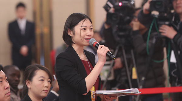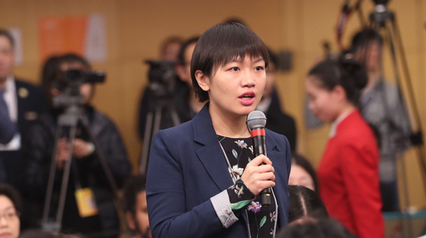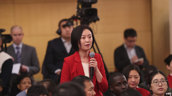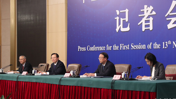 十三屆全國人大一次會議新聞中心于3月7日在梅地亞中心多功能廳舉行記者會,邀請農業部部長韓長賦,農業部新聞發言人、辦公廳主任潘顯政就“實施鄉村振興戰略推動農業轉型升級”的相關問題回答中外記者的提問。圖為記者會主持人。