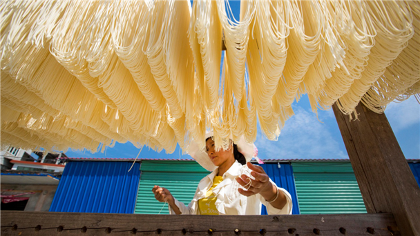 進入秋季,江西九江市都昌縣陽峰鄉金星村村民利用晴好天氣,忙著加工、晾曬面條,供應市場。陽峰面條柔軟而富有韌性,在市場上頗受歡迎,成為當地村民特色增收產業。